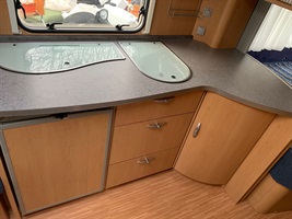 Velké rozkládací sezení ve tvaru U, velká francouzská postel, kuchyň, WC se sprchou a sprchovou vaničkou, umyvadlo zvlášť