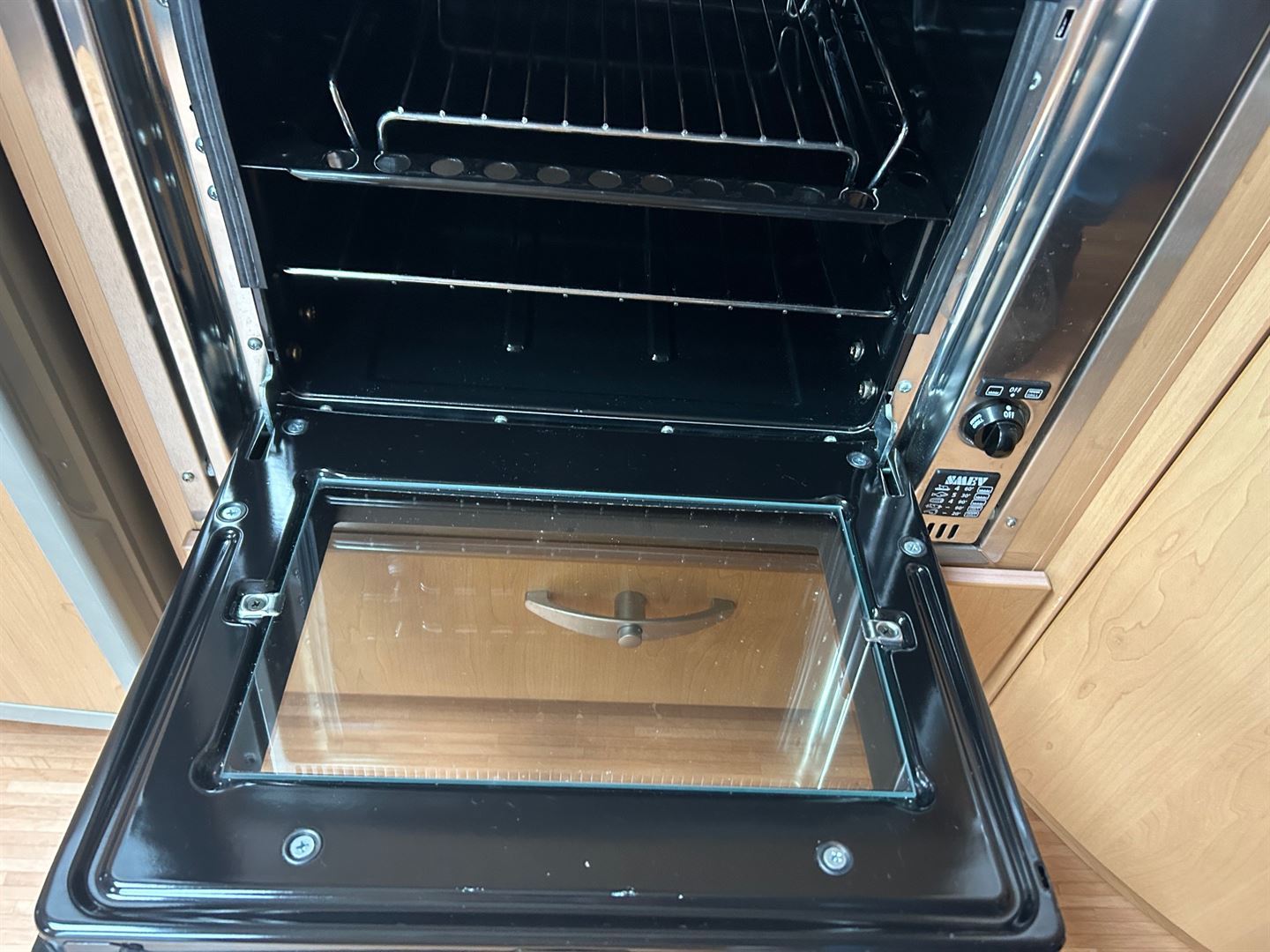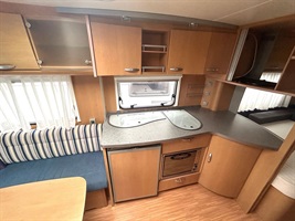 Velké rozkládací sezení ve tvaru U, velká francouzská postel, kuchyň, WC se sprchou a sprchovou vaničkou, toaletní koutek