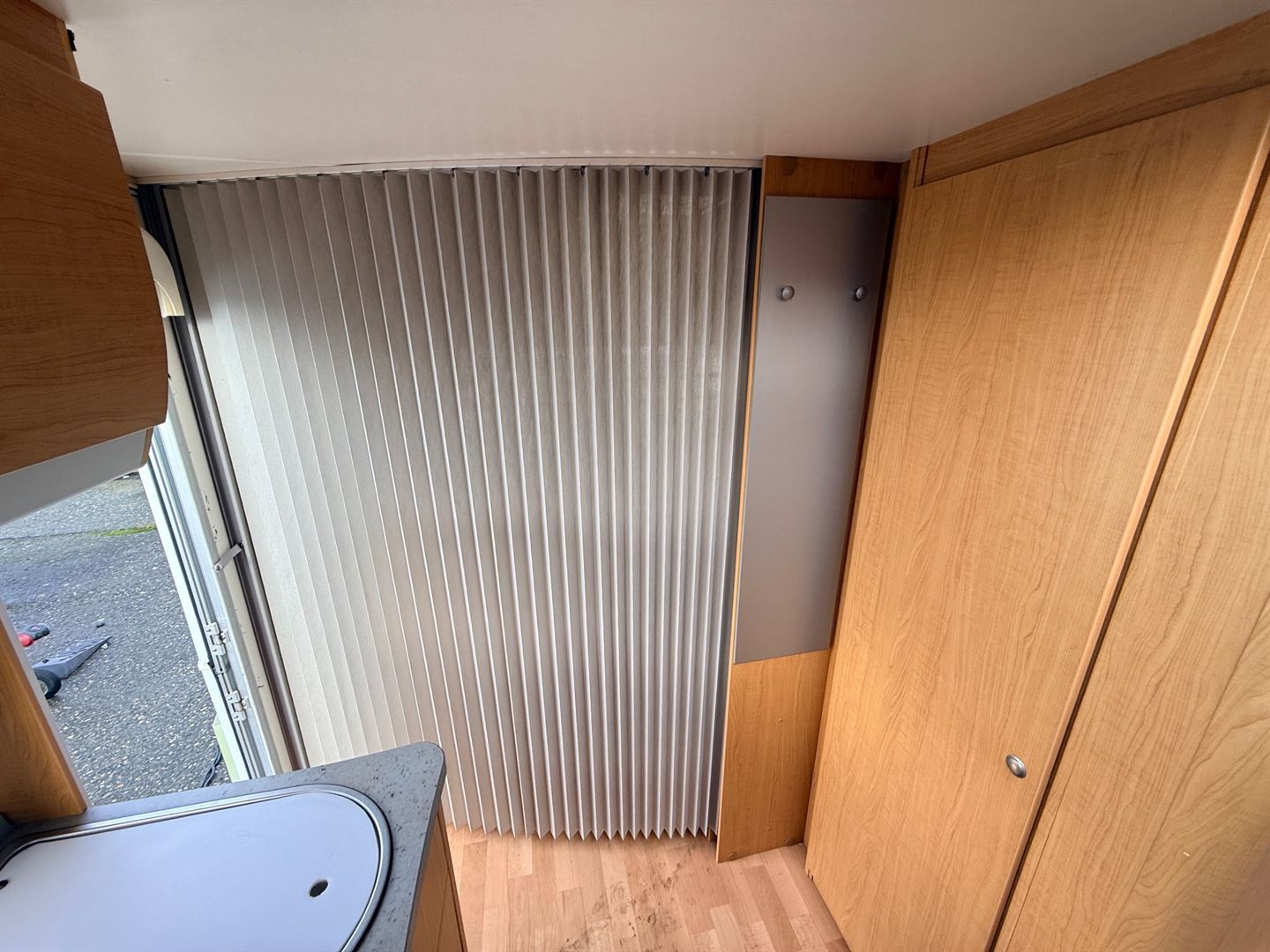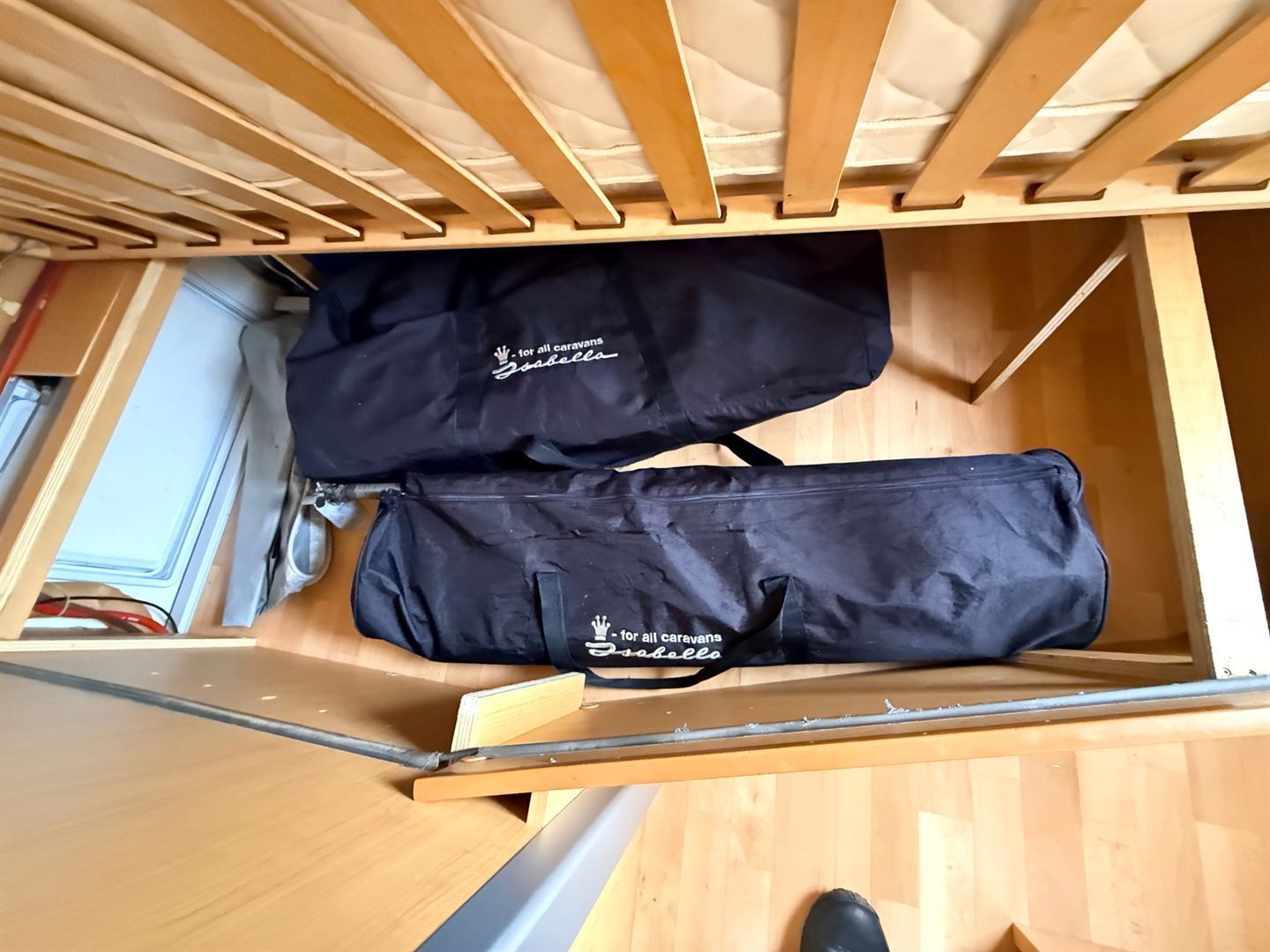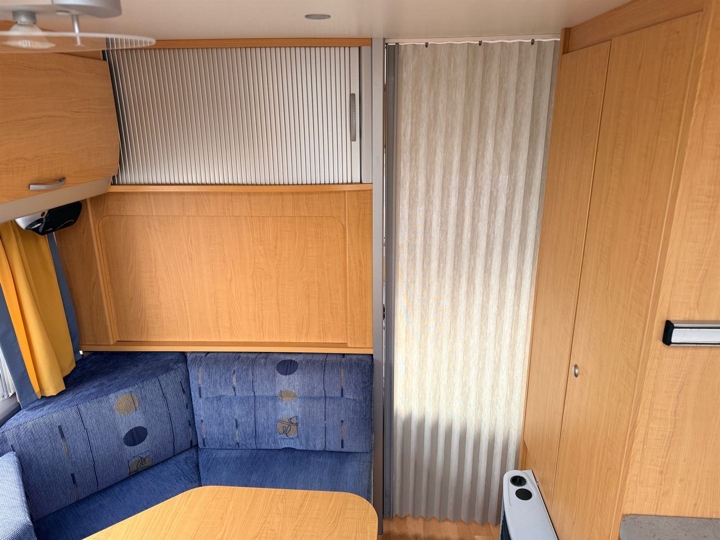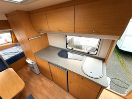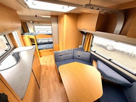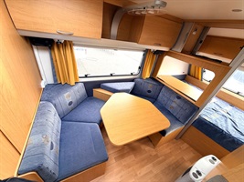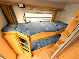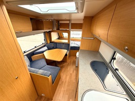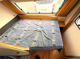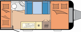 Rozkládací boční sezení, velká příčná postel, palandy, velká kuchyň, WC se sprchovou vaničkou a umyvadlem.