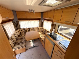 Velké rozkládací sezení ve tvaru U, francouzská postel, kuchyň, WC se sprchou, toaletní koutek