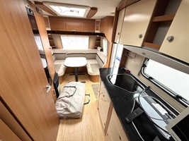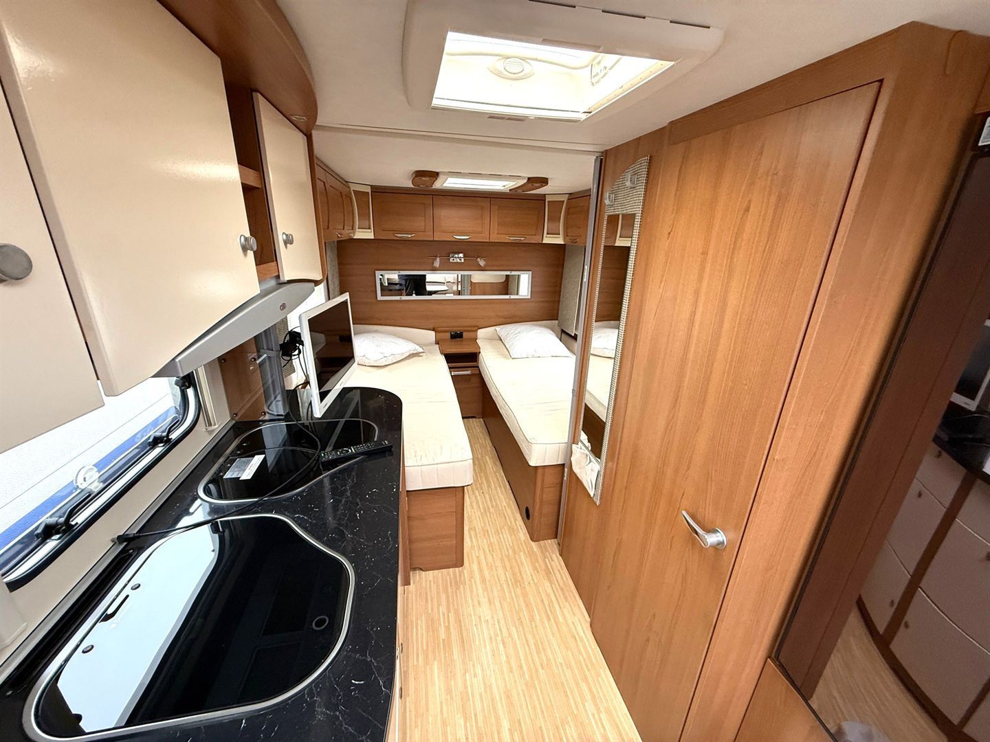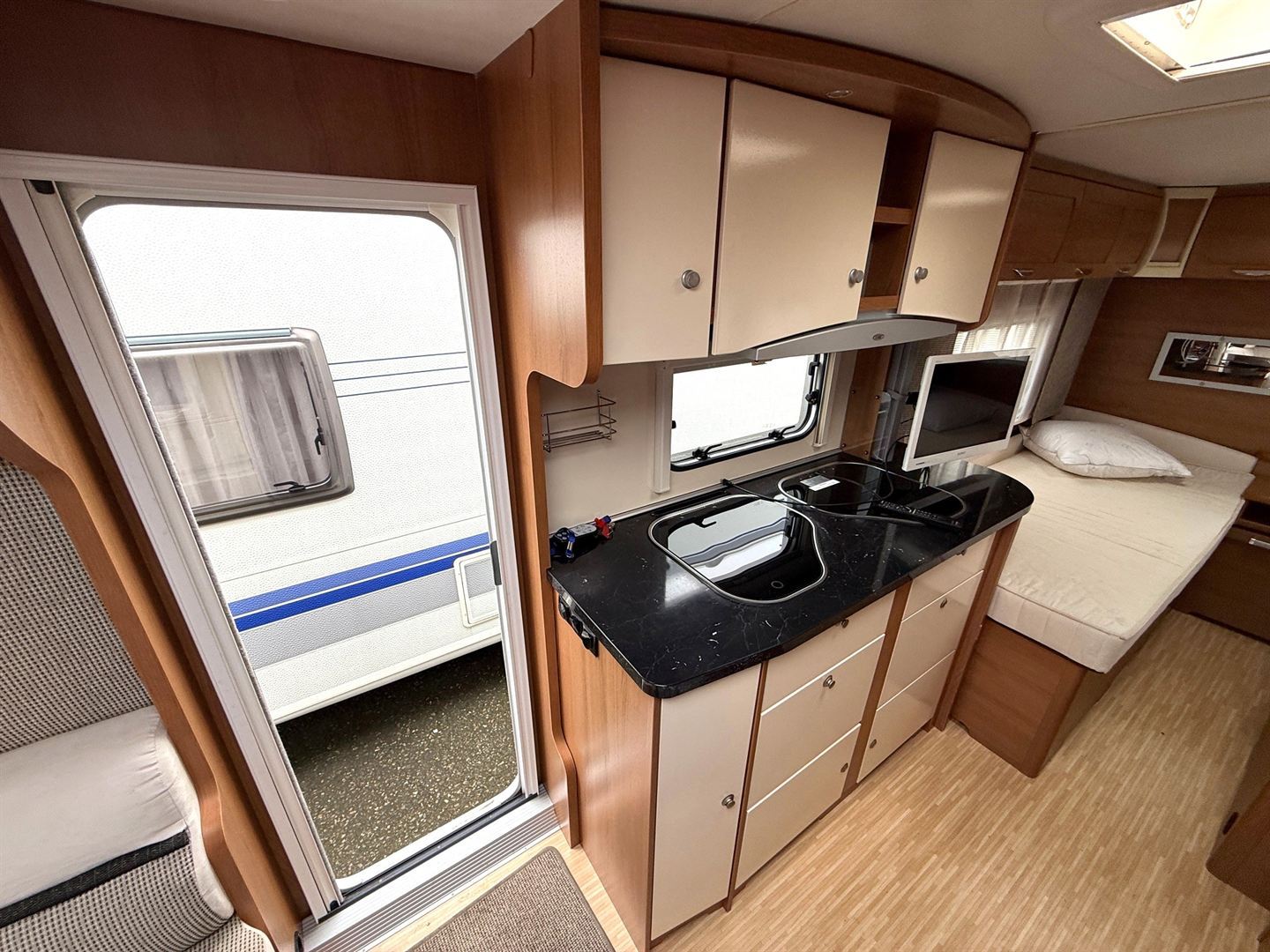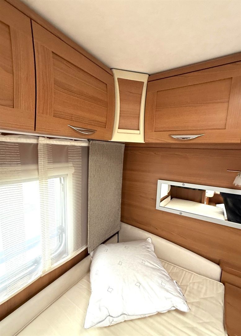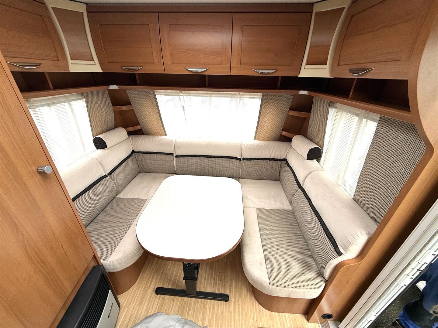 Rozkládací sezení do "U" , 2 oddělené postele + výsuvný rošt s matrací pro vytvoření velké postele, kuchyň, WC se sprchovou vaničkou a umyvadlem.