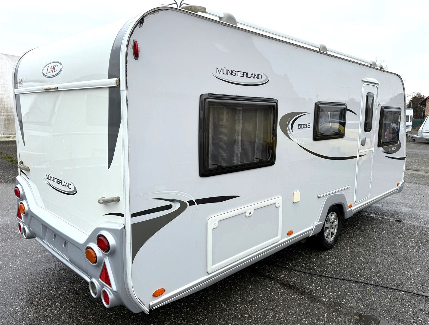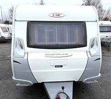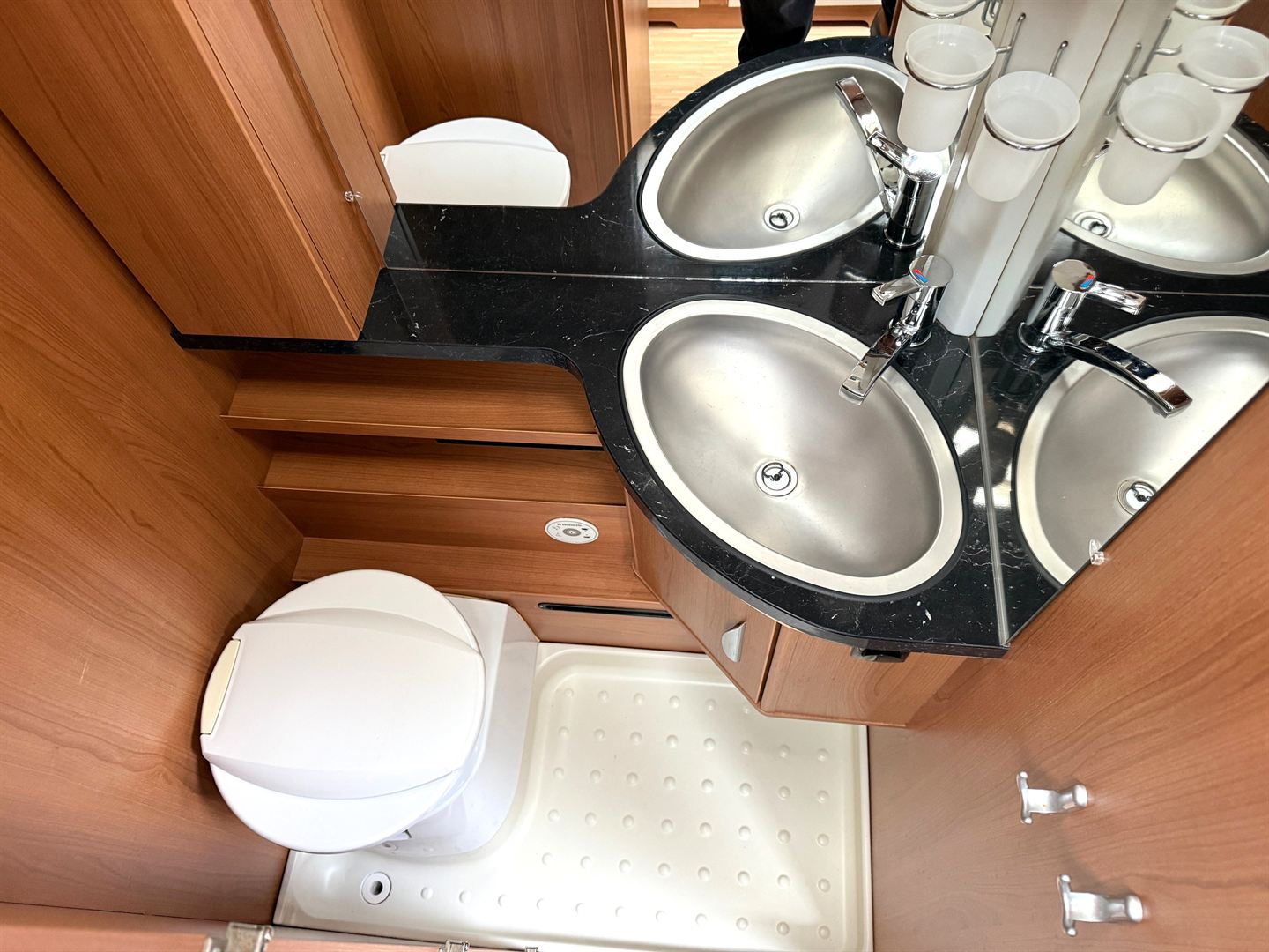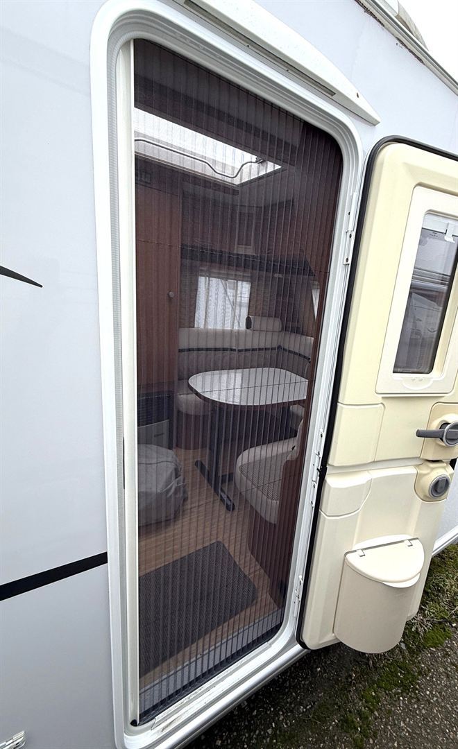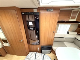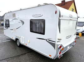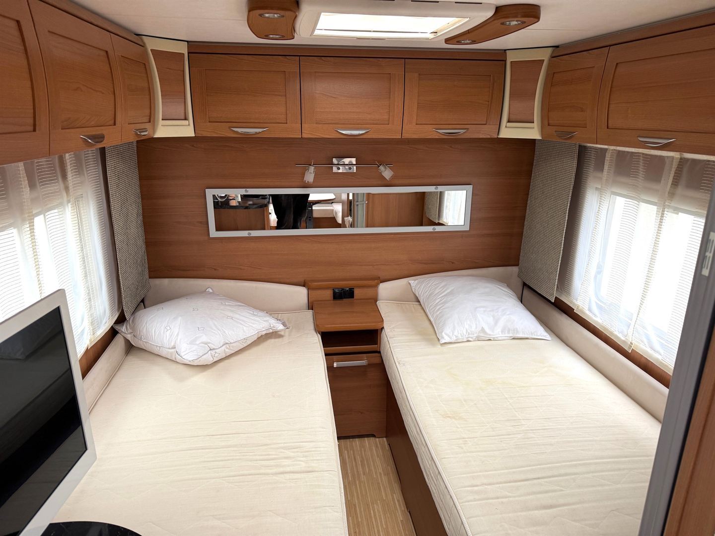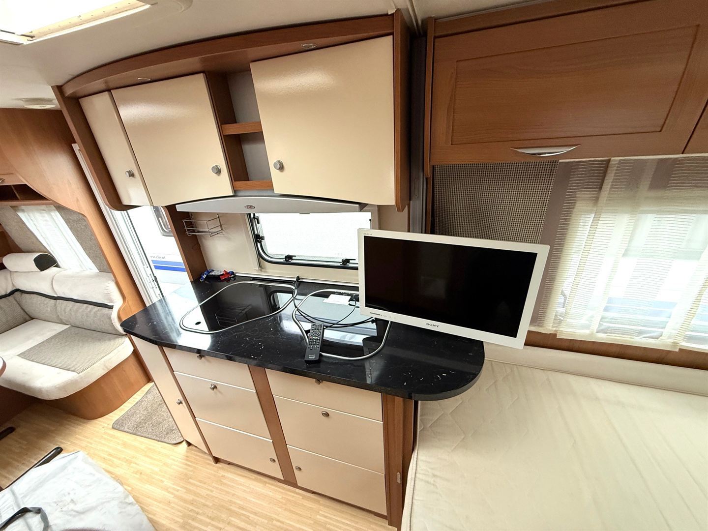 Rozkládací sezení do "U" , 2 oddělené postele + výsuvný rošt s matrací pro vytvoření velké postele, kuchyň, WC se sprchovou vaničkou a umyvadlem.