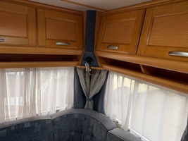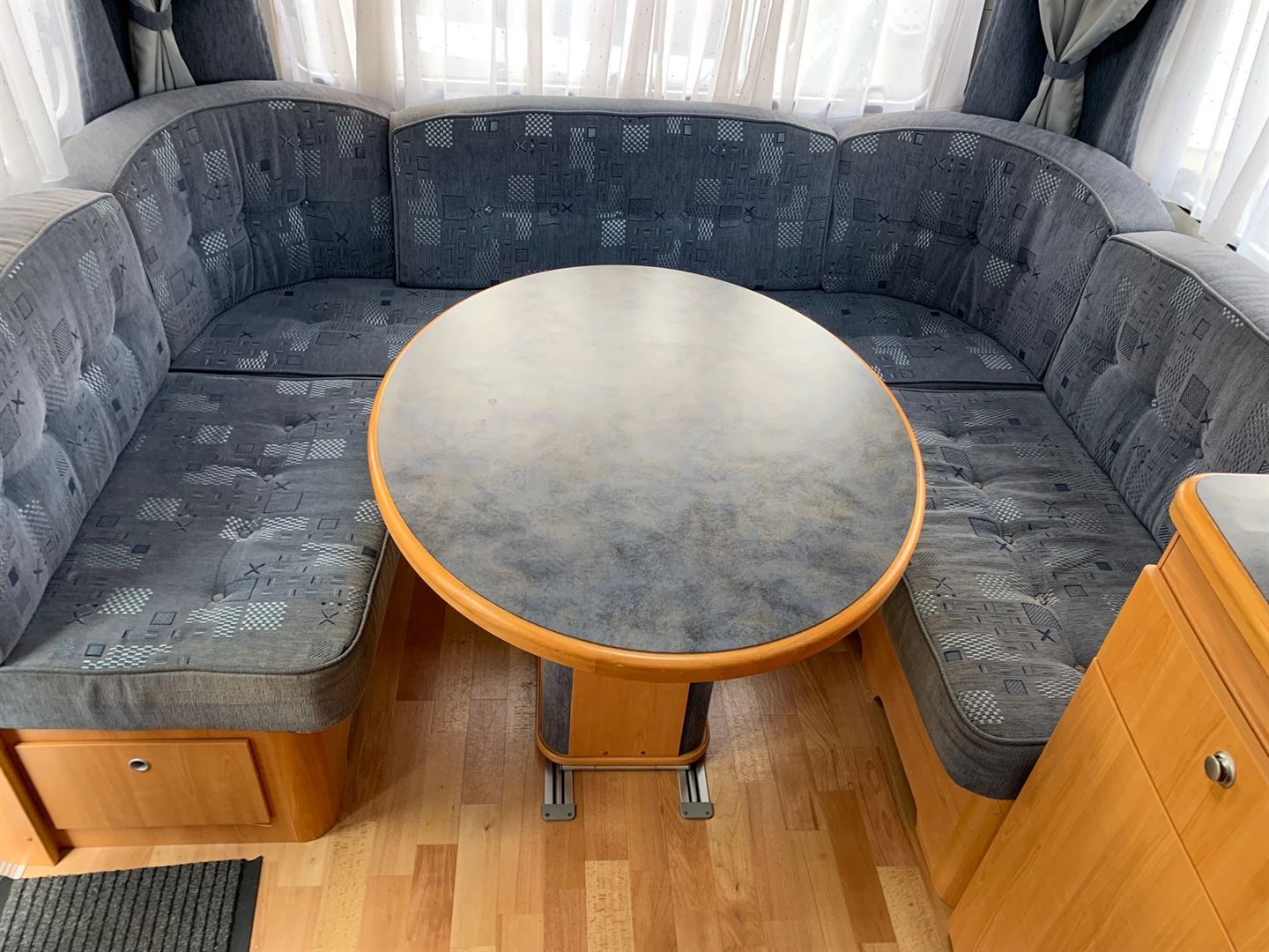 Velké rozkládací sezení ve tvaru U, francouzská postel, kuchyň, WC se sprchou, toaletní koutek