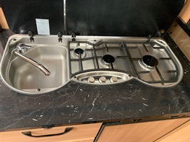 Rozkládací sezení ve tvaru U, dvě oddělené postele + rošt pro vytvoření velkého letiště, kuchyň, WC s umyvadlem