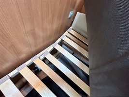 Rozkládací sezení do ,,U", velká francouzská postel, kuchyň, WC se sprchovou vaničkou, umyvadlo zvlášť.