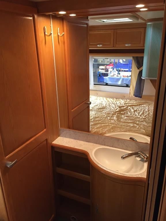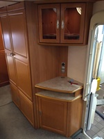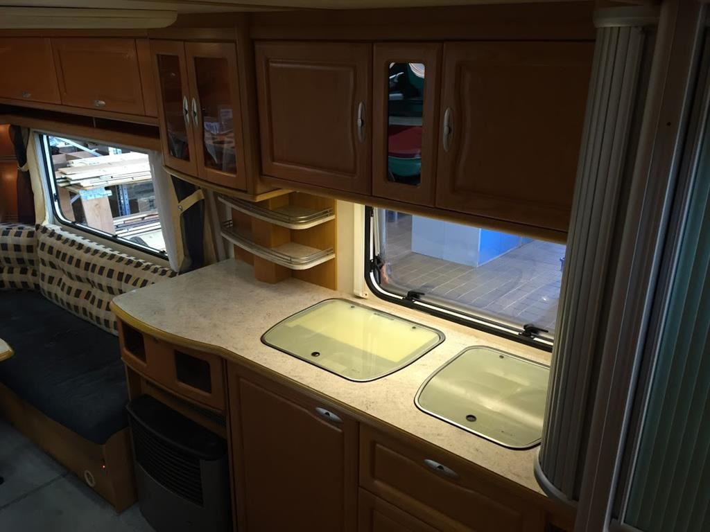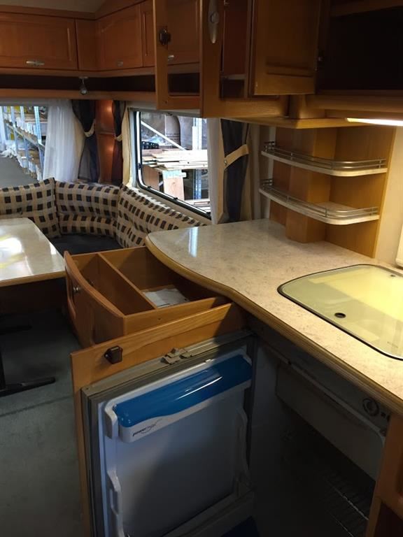 Velké rozkládací sezení do ,,U", velká francouzská postel, kuchyň, WC se sprchou, umyvadlo zvlášť.
