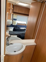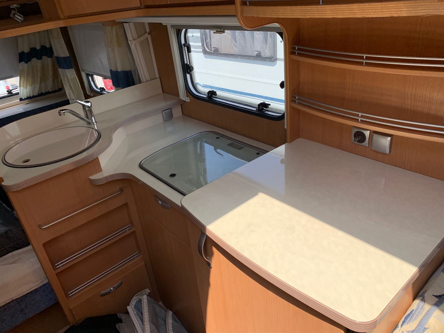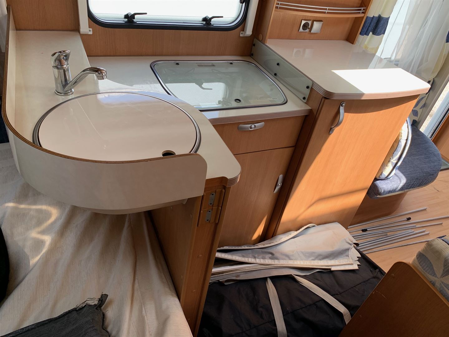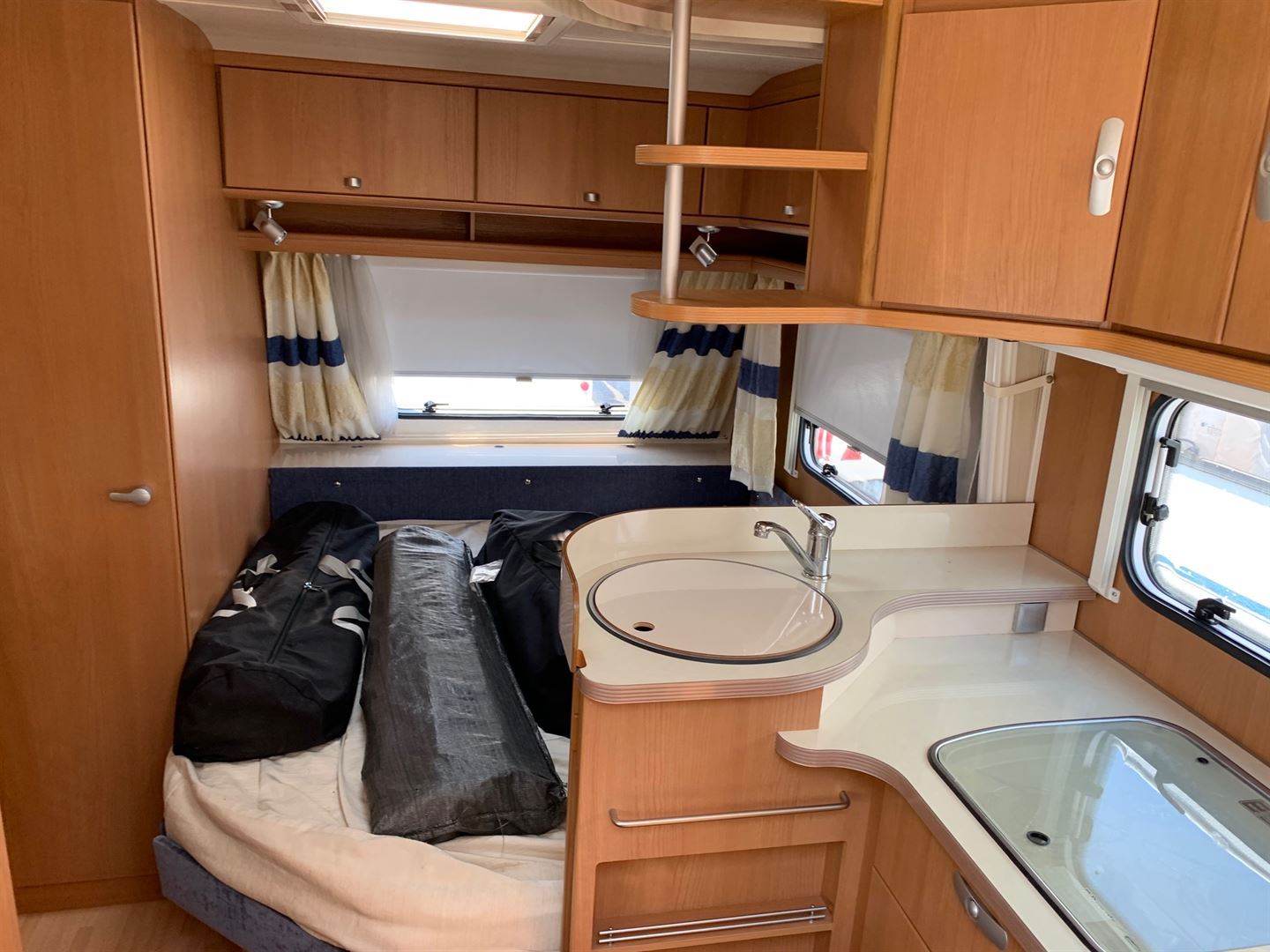 Rozkládací boční sezení, velká francouzská postel, palandy, kuchyň, WC se sprchou, umyvadlo zvlášť.