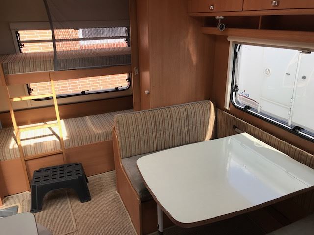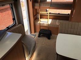 Rozkládací boční sezení, velká francouzská postel, palandy, kuchyň, WC se sprchou, umyvadlo zvlášť.
