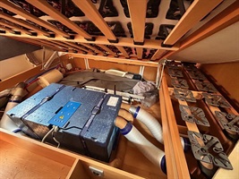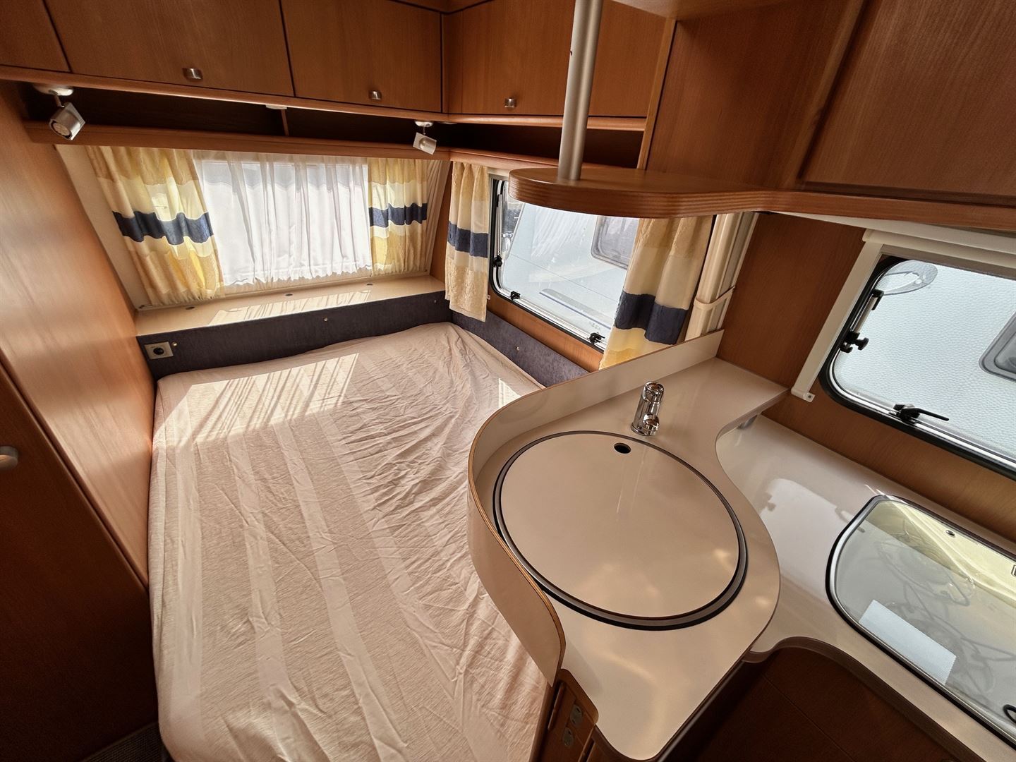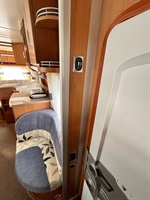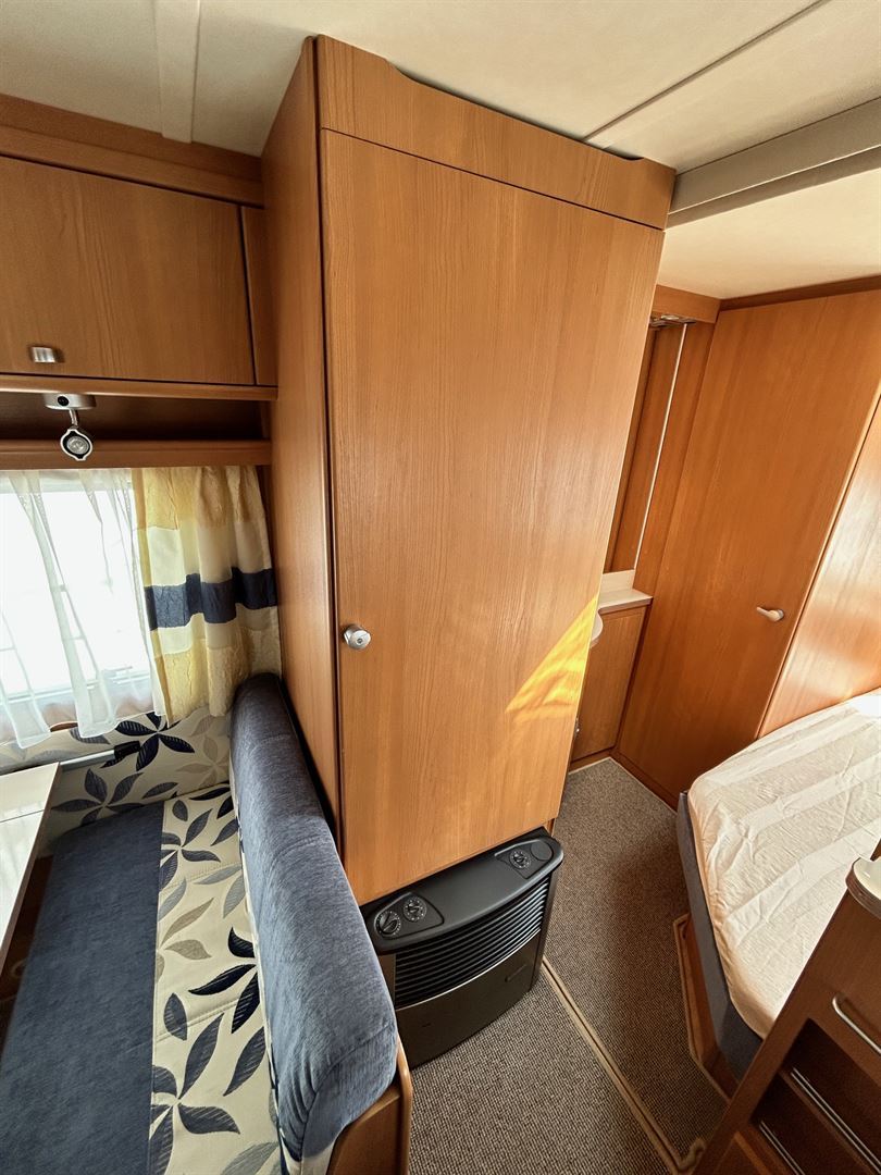Boční rozkládací sezení, samostatný gauč, francouzská postel s velmi pohodlným roštem FROLLI ,2 x velká palanda přes celou šíři karavanu s žebříkem, kuchyň, WC se sprchou, toaletní koutek