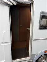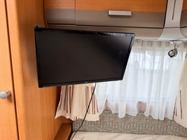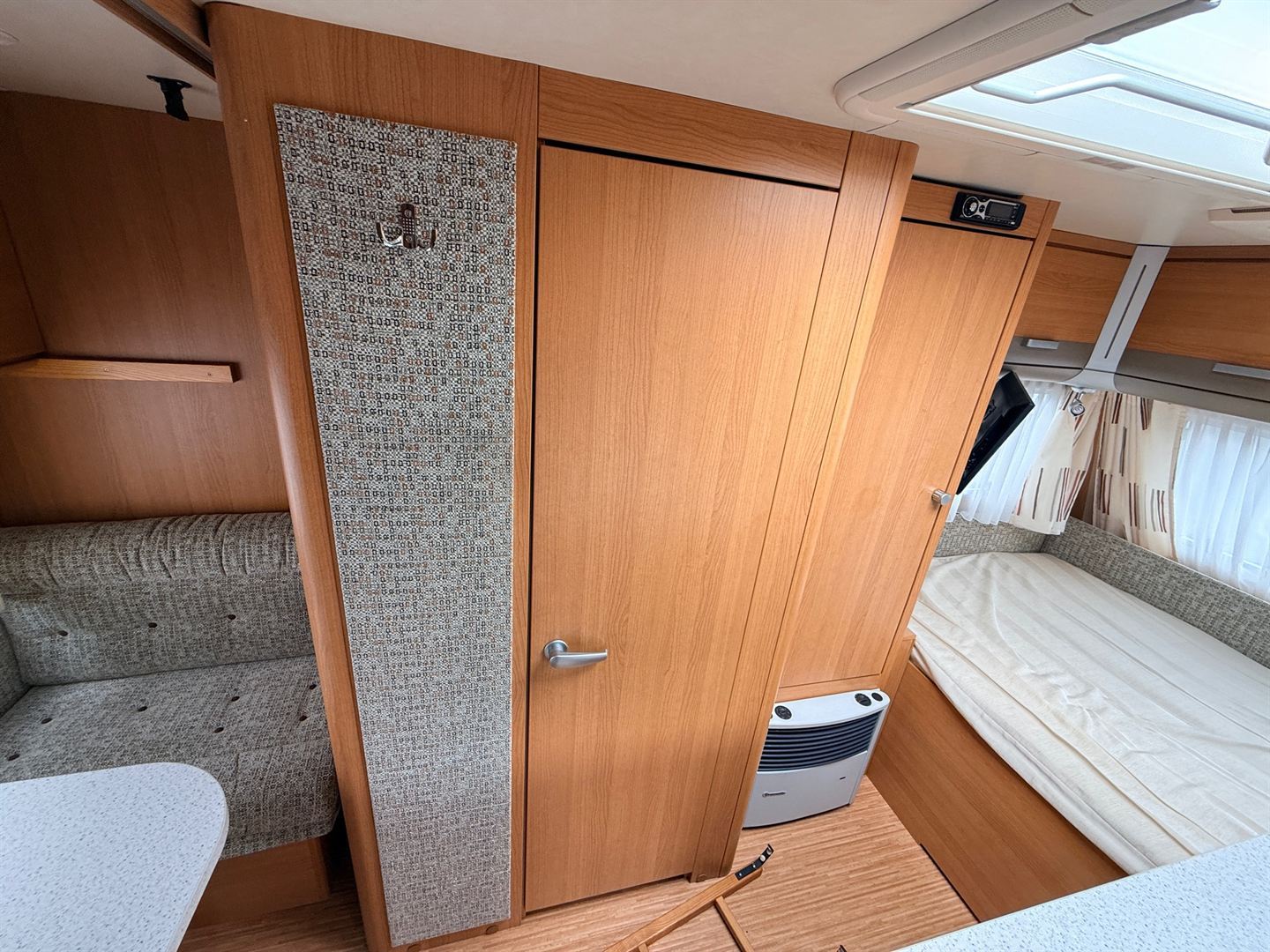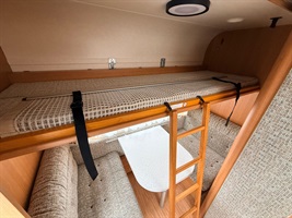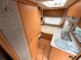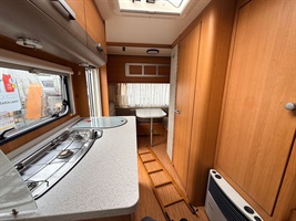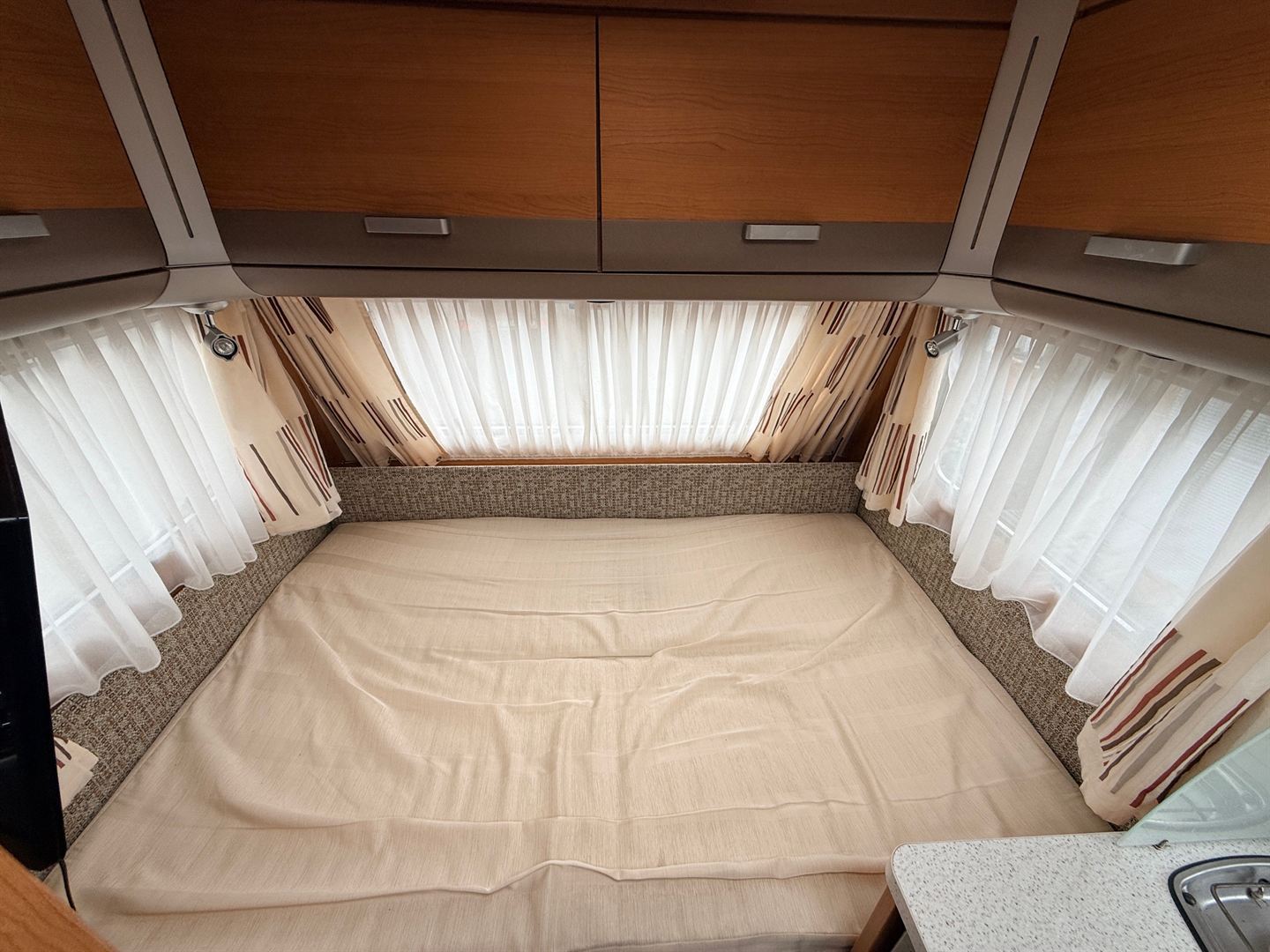 Rozkládací boční sezení- nad ním výklopná skříňka na palandu, francouzská postel přes šíři karavanu, kuchyň, WC s umyvadlem, sprchou a sprchovou vaničkou.