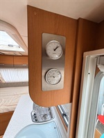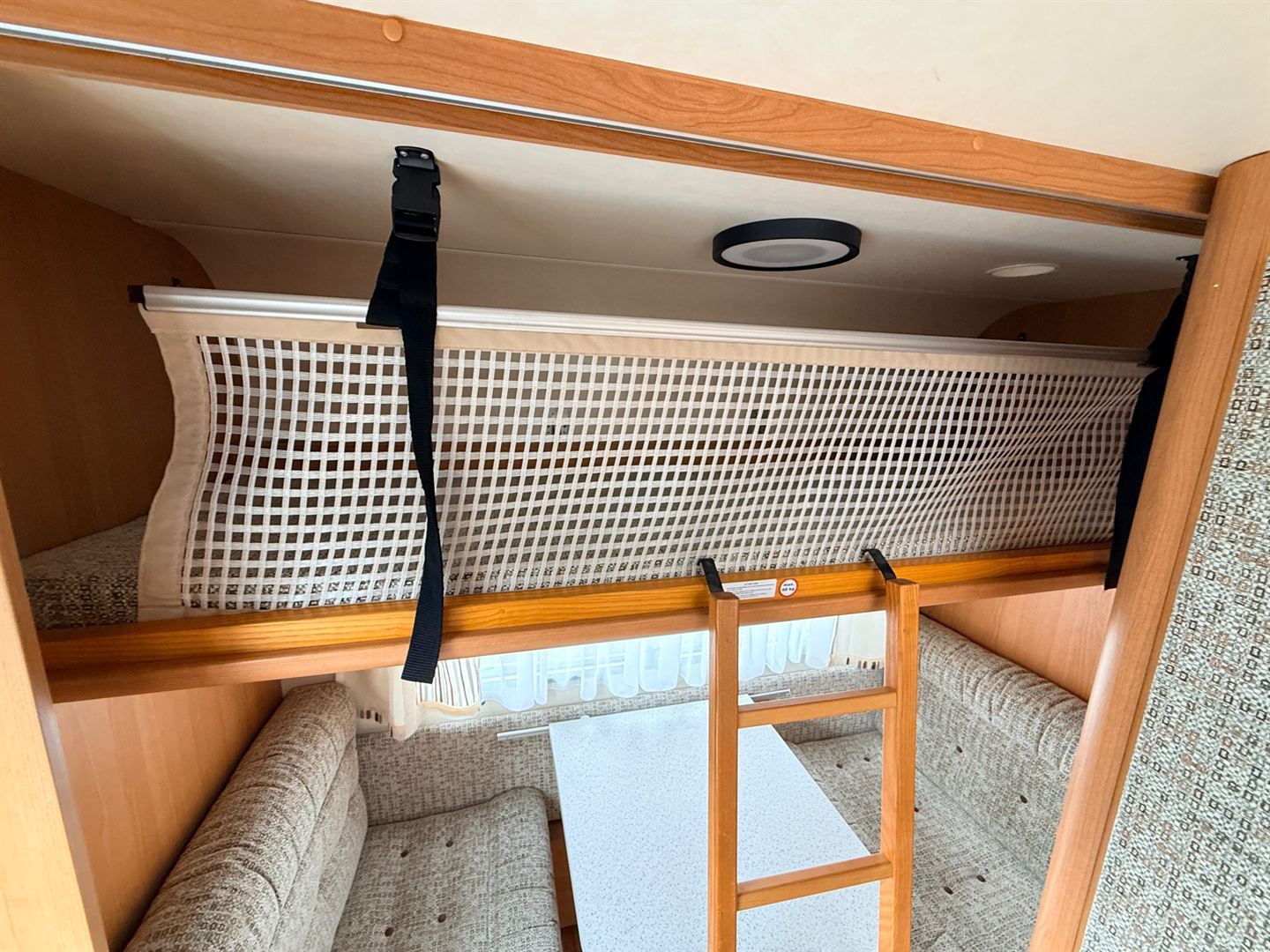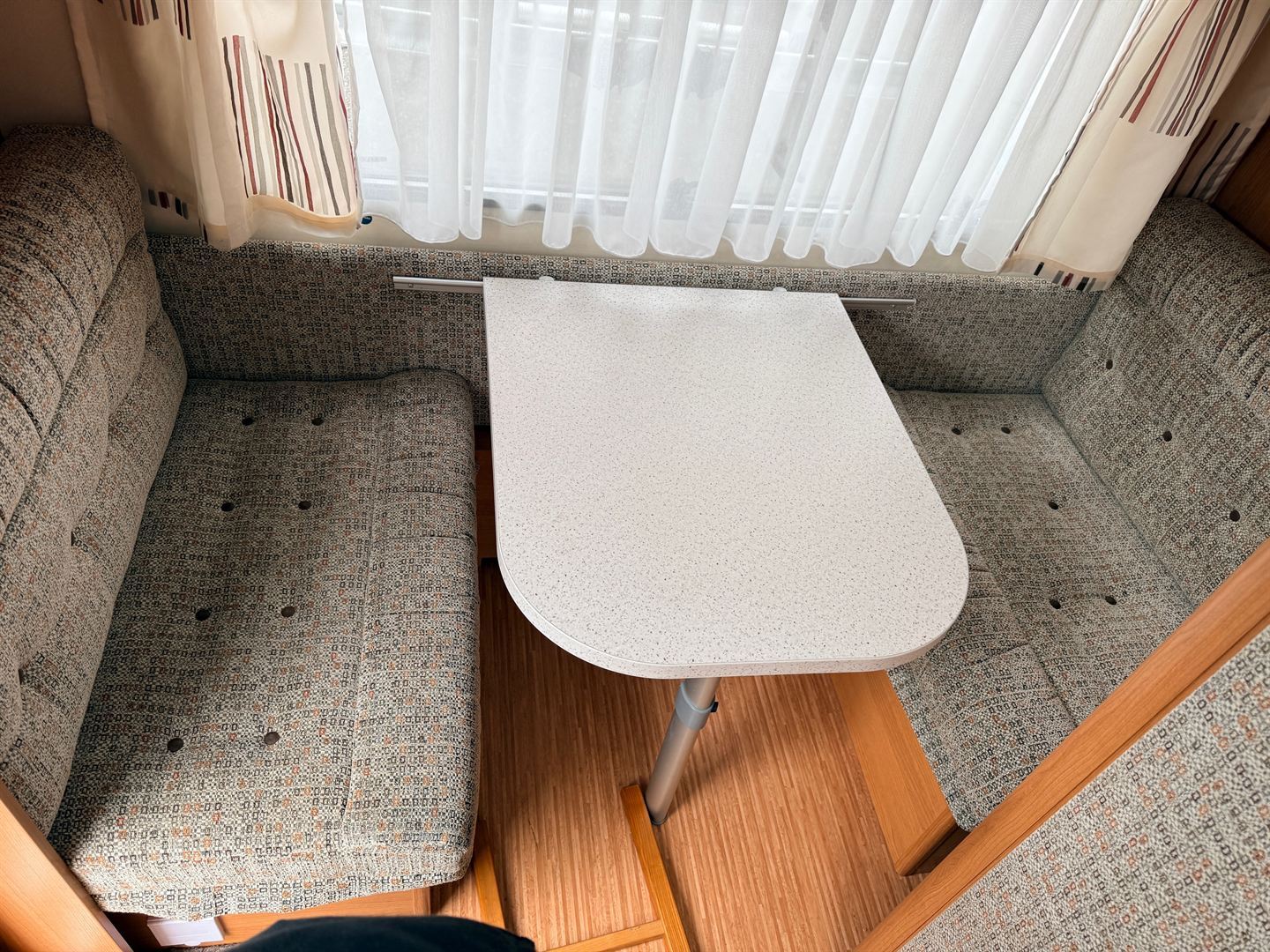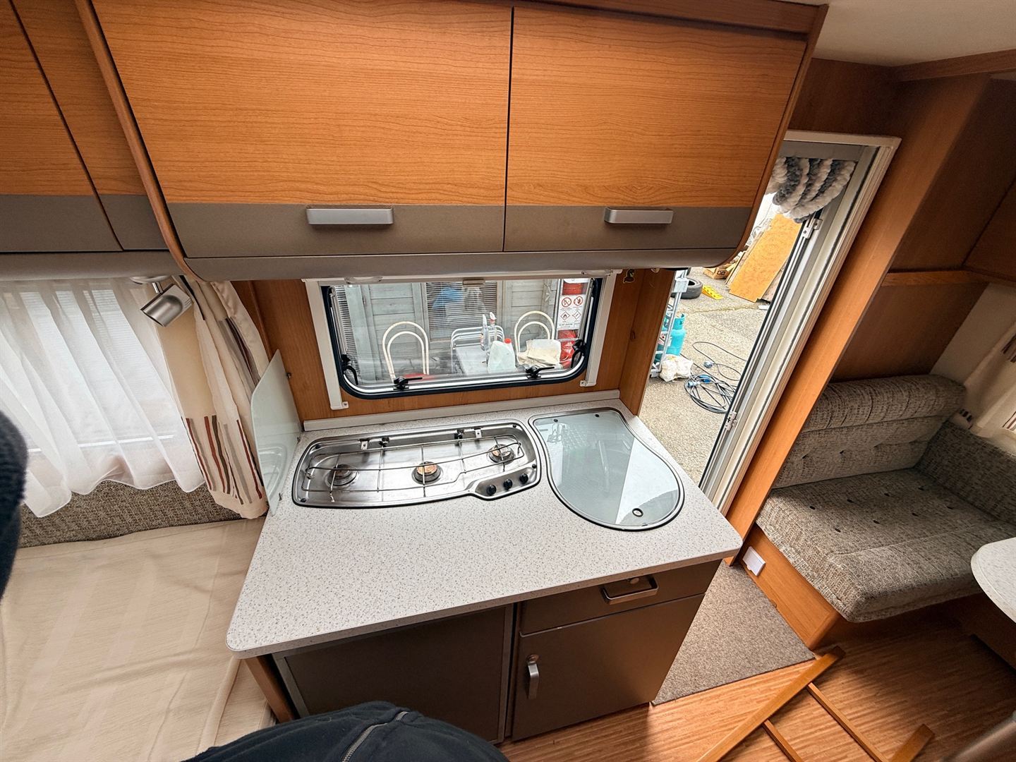 Rozkládací boční sezení- nad ním výklopná skříňka na palandu, francouzská postel přes šíři karavanu, kuchyň, WC s umyvadlem, sprchou a sprchovou vaničkou.
