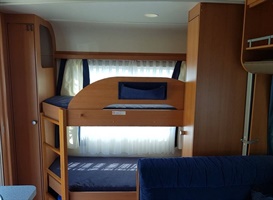 Boční rozkládací sezení, francouzská postel, velká palanda s žebříkem, kuchyň, WC, toaletní koutek
