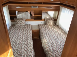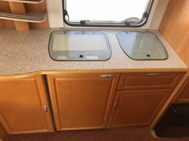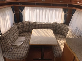 Rozkládací sezení ve tvaru U, dvě oddělené postele (možnost dokoupení roštu pro vytvoření velkého letiště), kuchyň, WC s umyvadlem