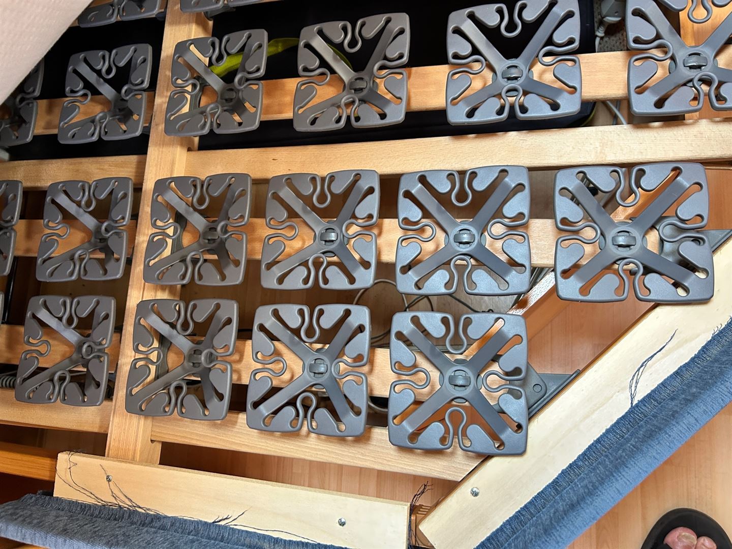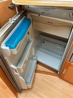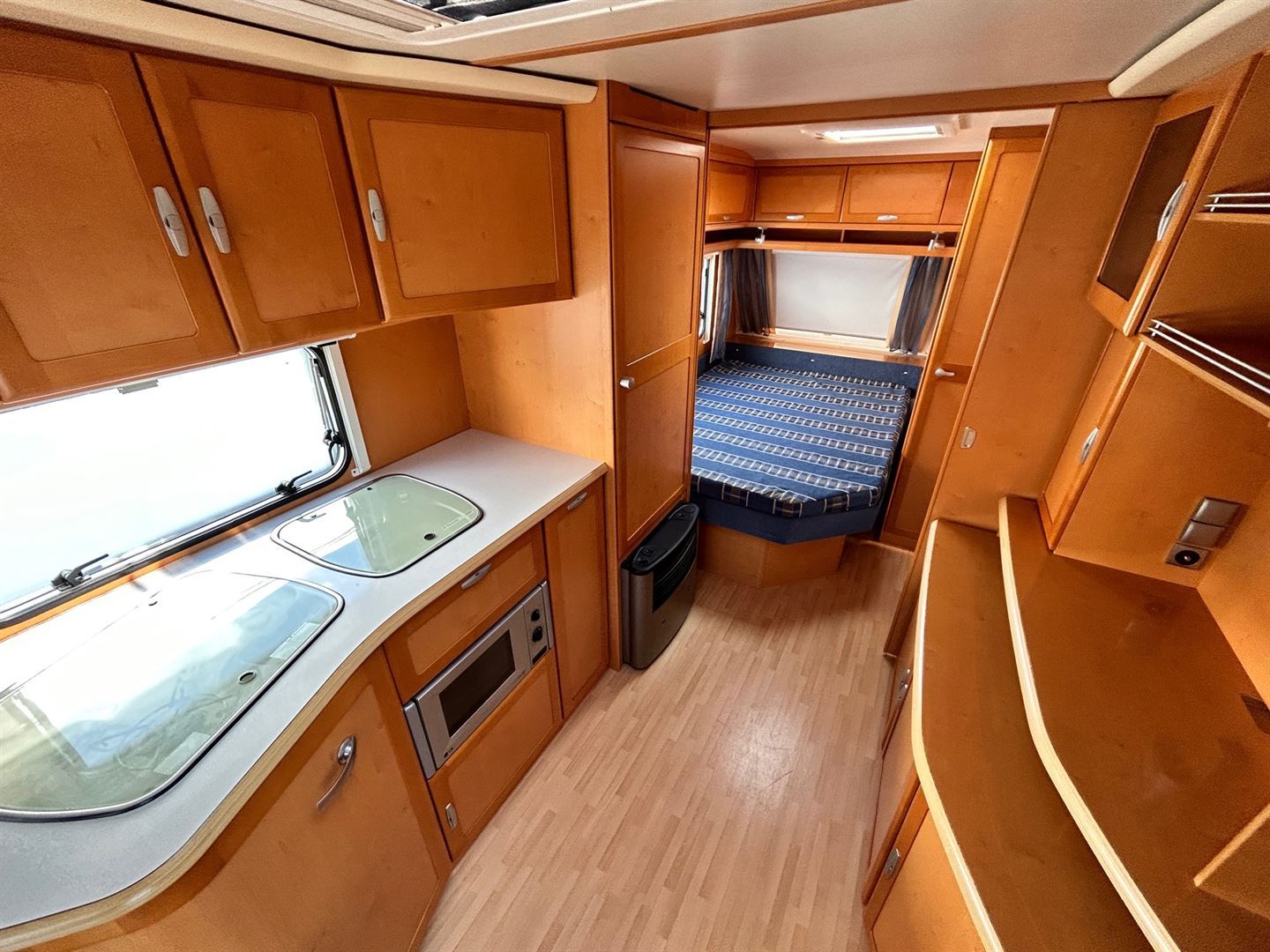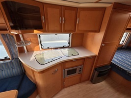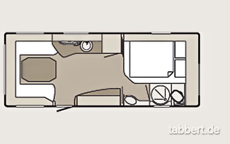 Velké rozkládací sezení ve tvaru U, velká francouzská postel, kuchyň, WC se sprchou, toaletní koutek