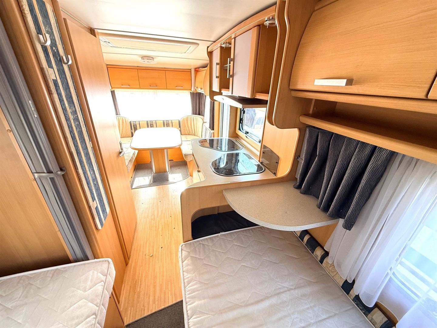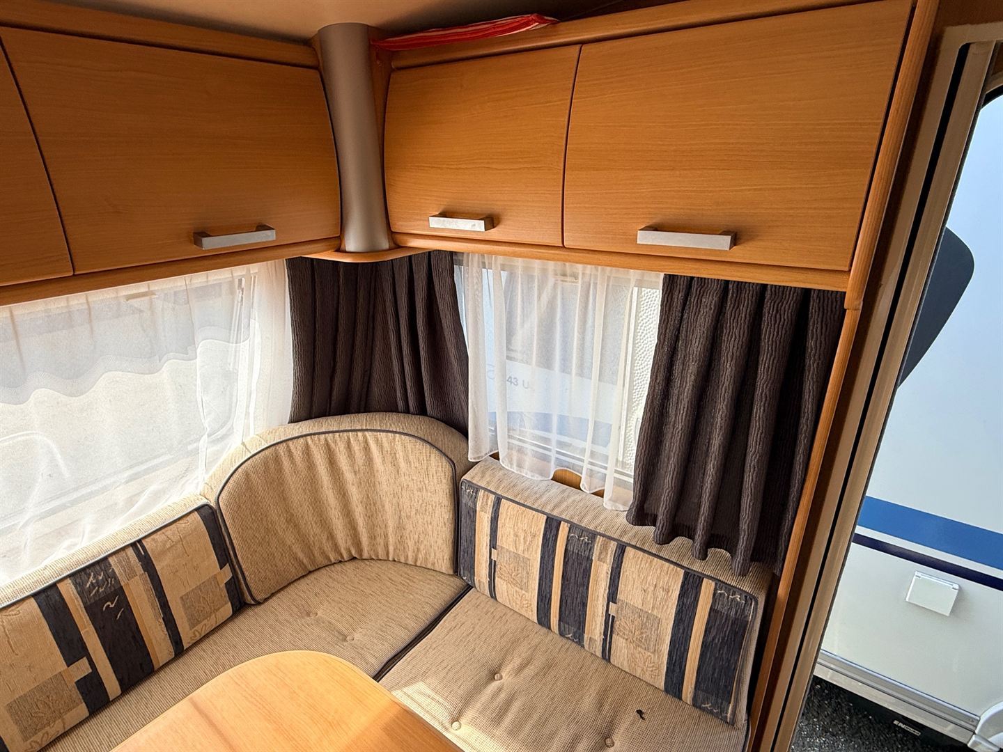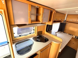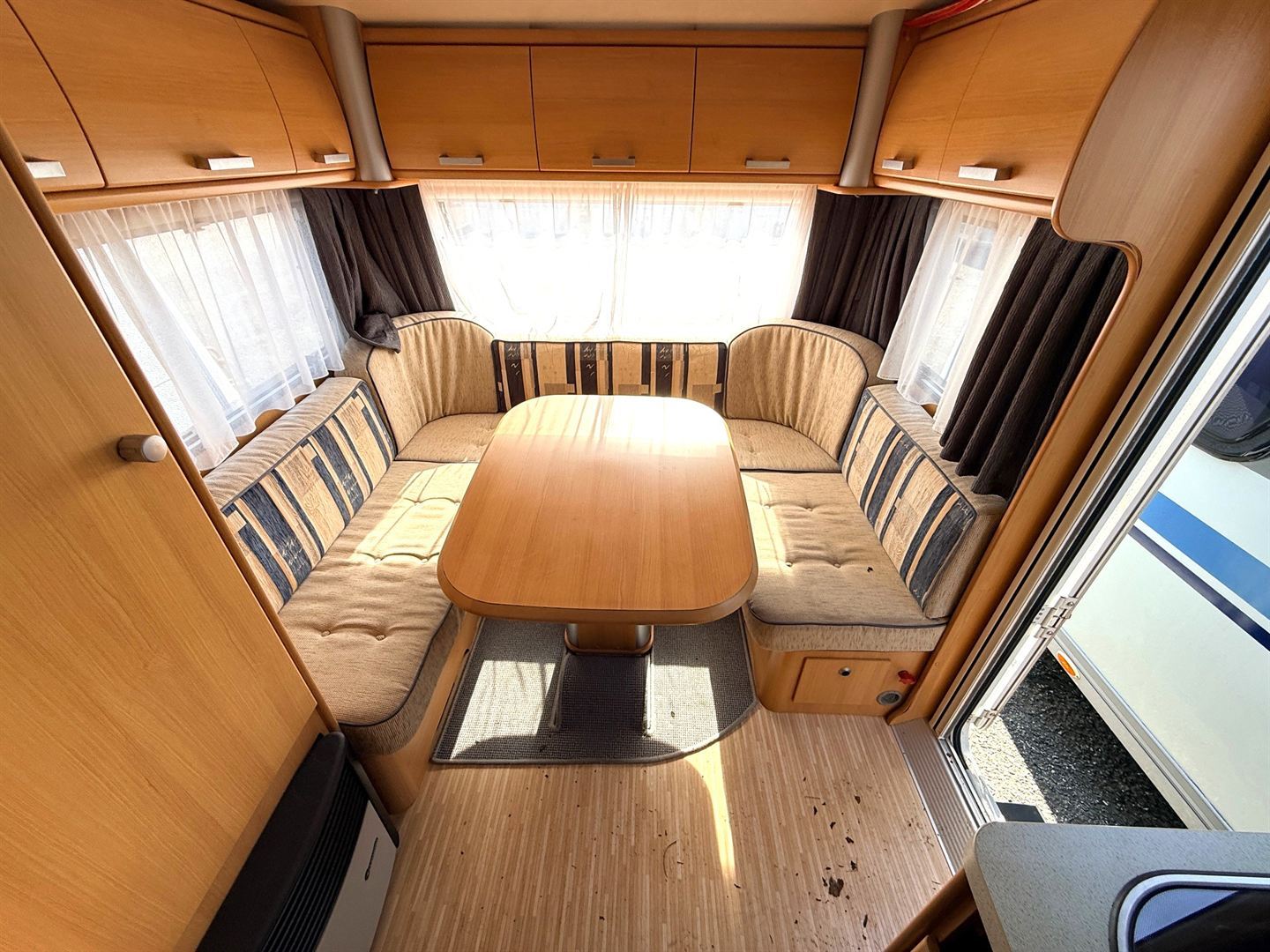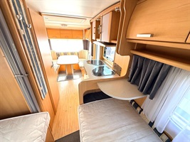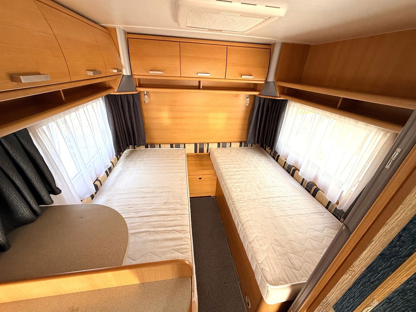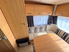 Rozkládací sezení ve tvaru U, dvě oddělené postele , kuchyň, WC s umyvadlem a sprchovou vaničkou