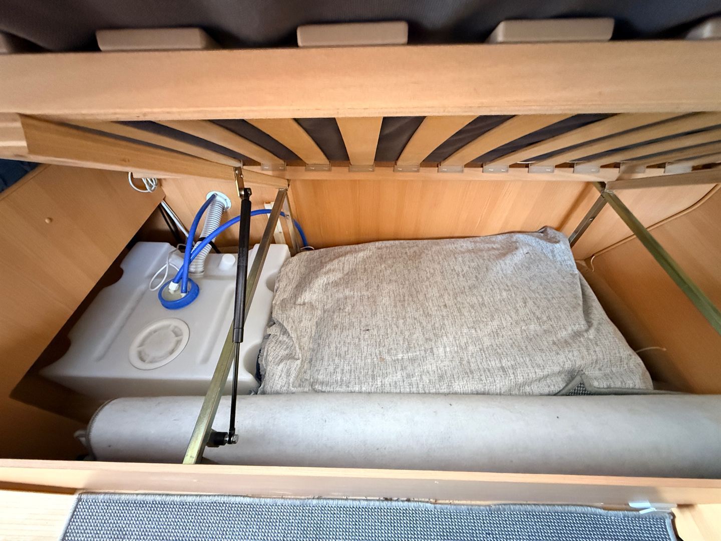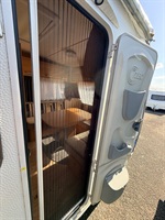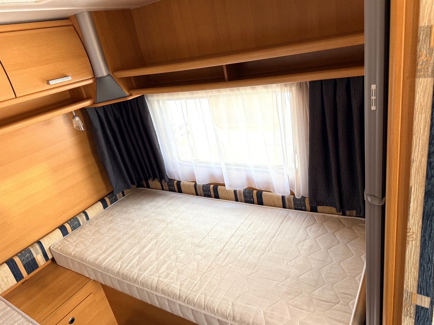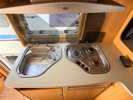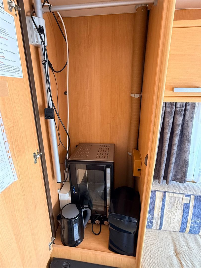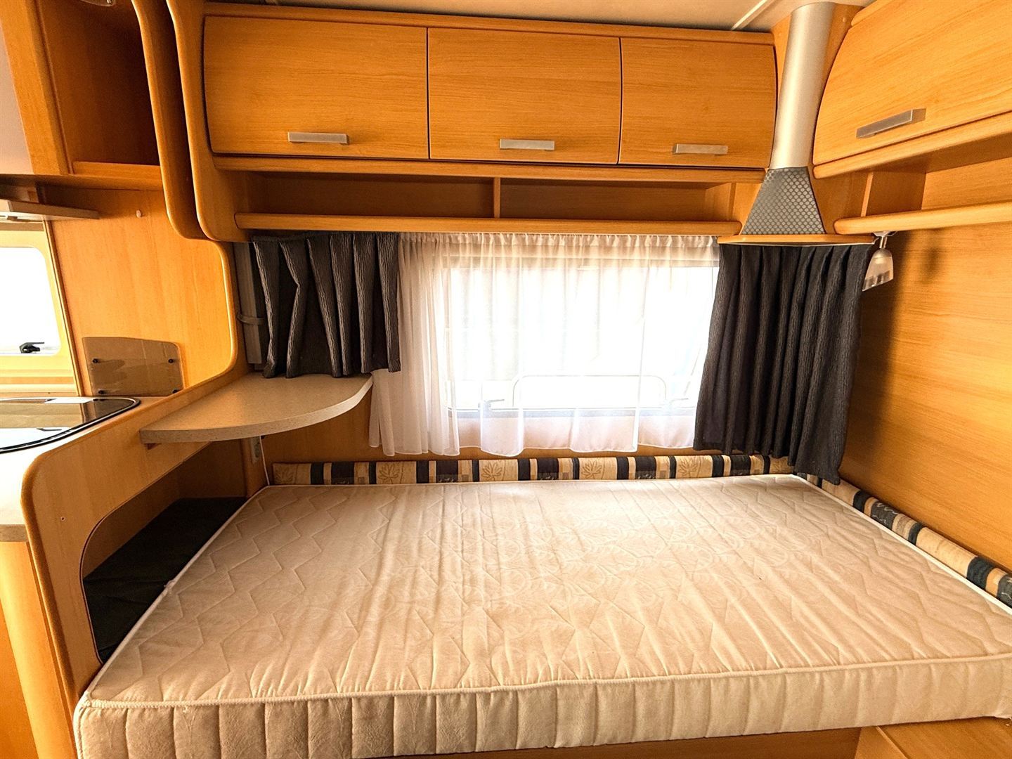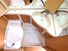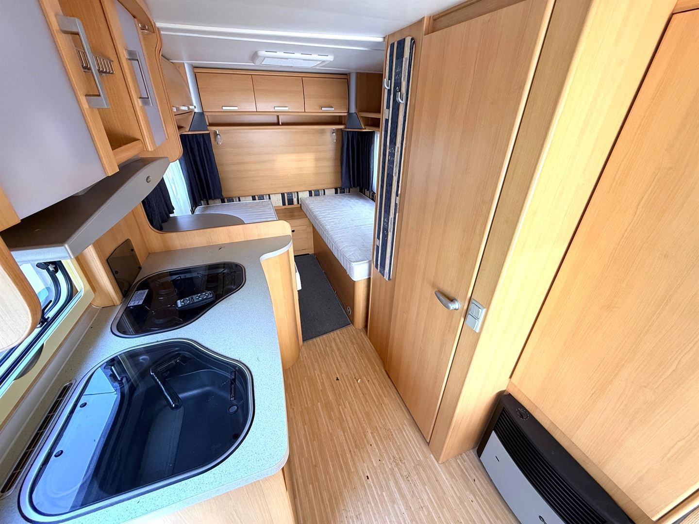 Rozkládací sezení ve tvaru U, dvě oddělené postele , kuchyň, WC s umyvadlem a sprchovou vaničkou