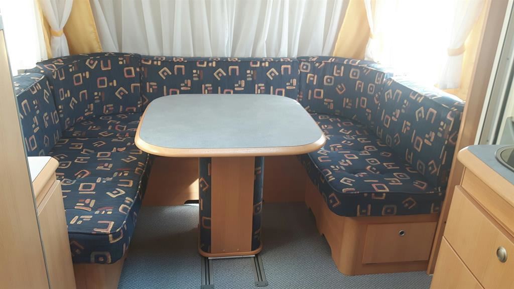 Velké rozkládací sezení do ,,U", velká francouzská postel, kuchyň, WC se sprchou a sprchovou vaničkou, umyvadlo zvlášť