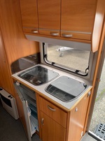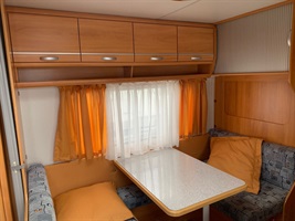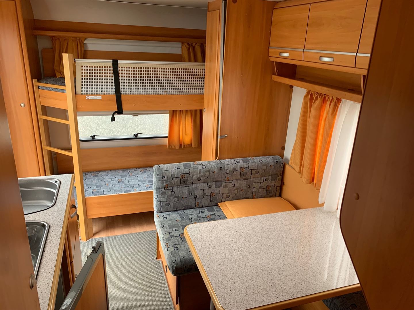 Rozkládací boční sezení, velká francouzská postel, palandy, kuchyň, WC, umyvadlo se zrcadlem zvlášť.