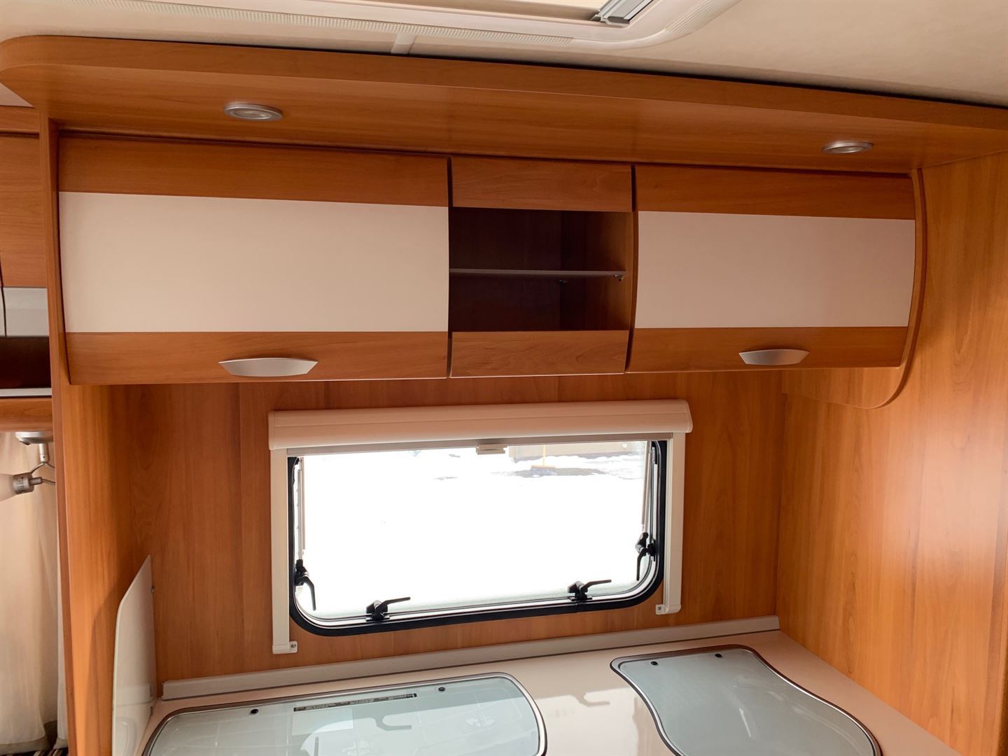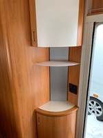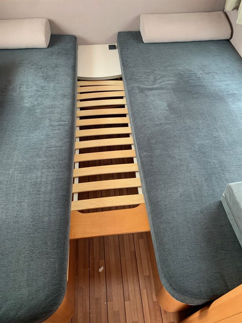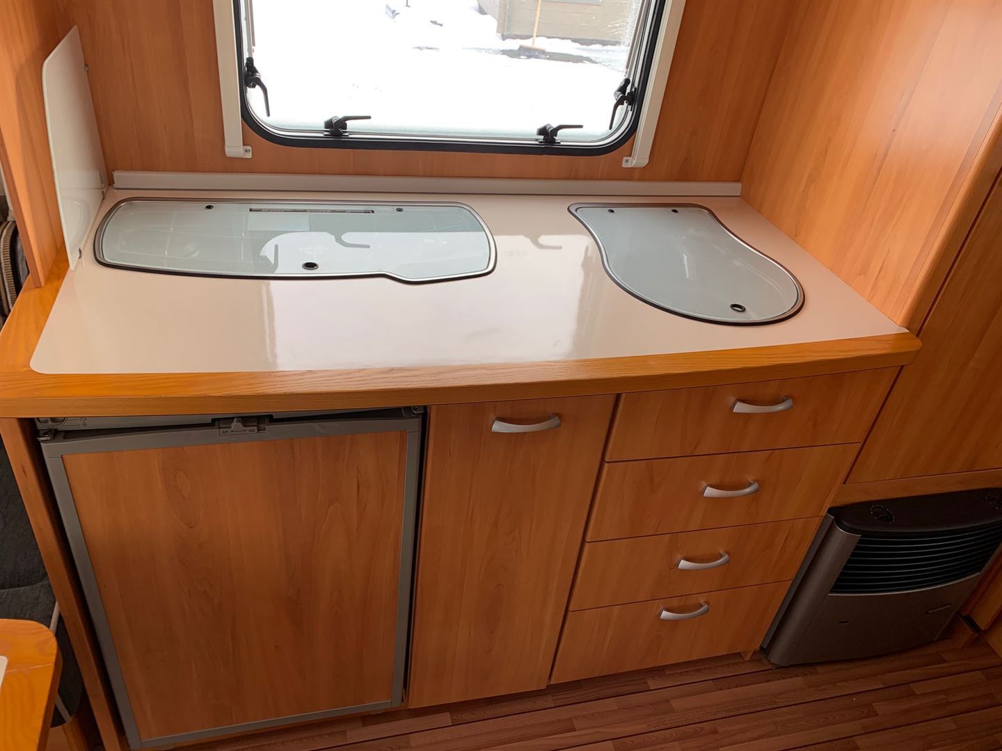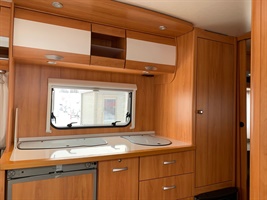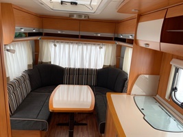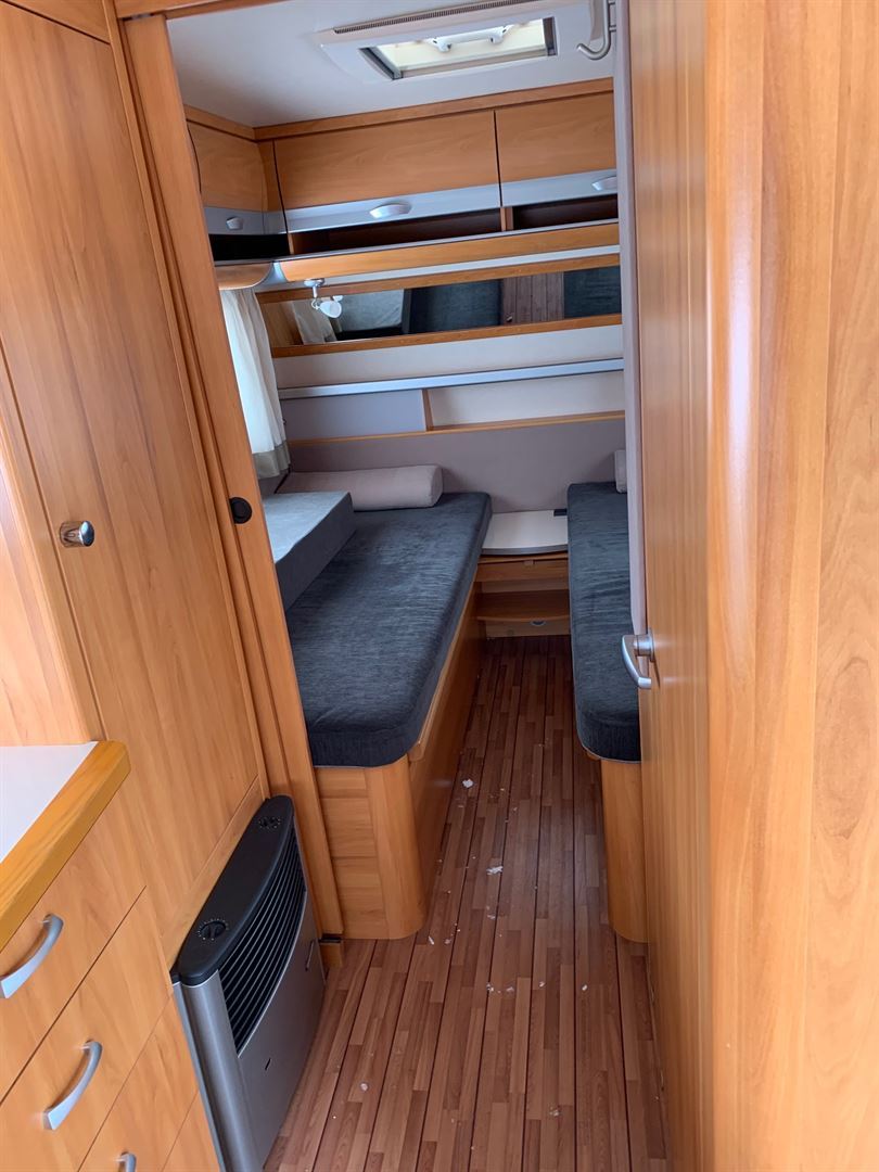 Rozkládací sezení ve tvaru U, dvě oddělené postele s vysouvacím roštem pro vytvoření velkého letiště, kuchyň, WC s umyvadlem