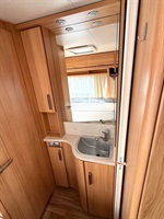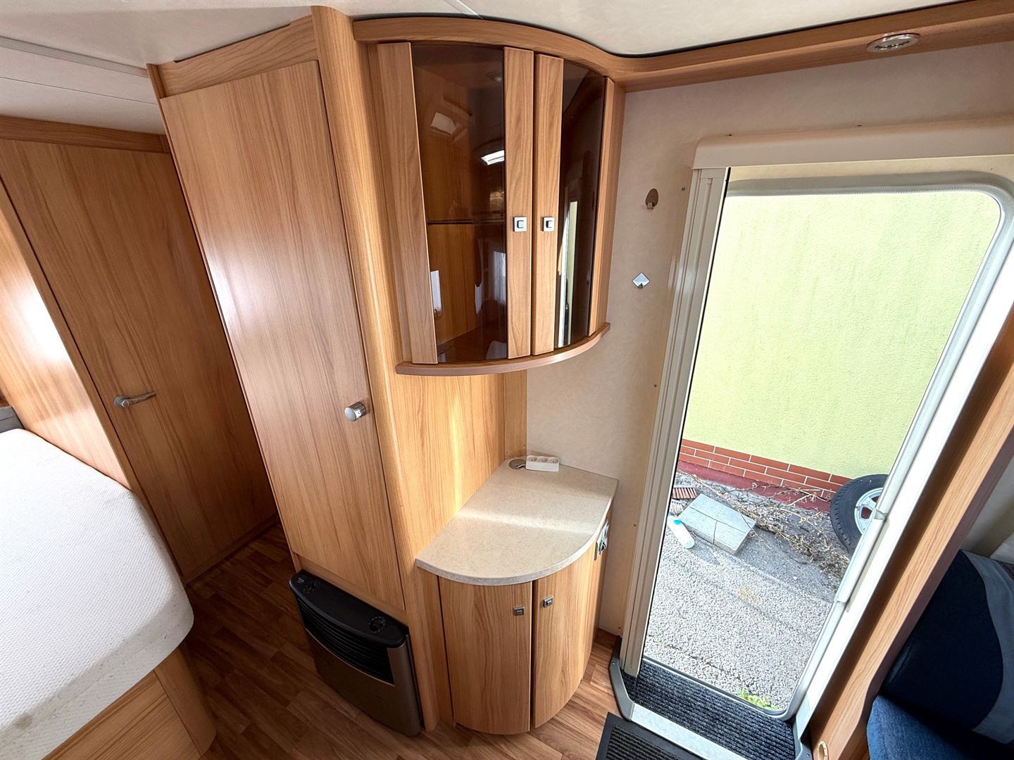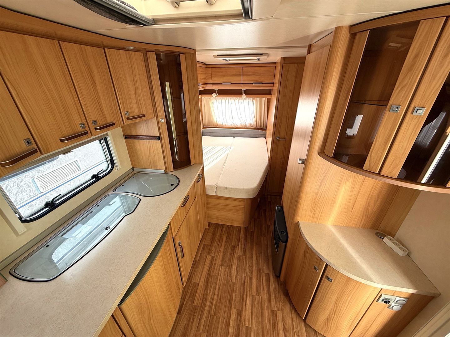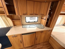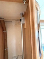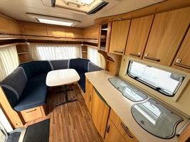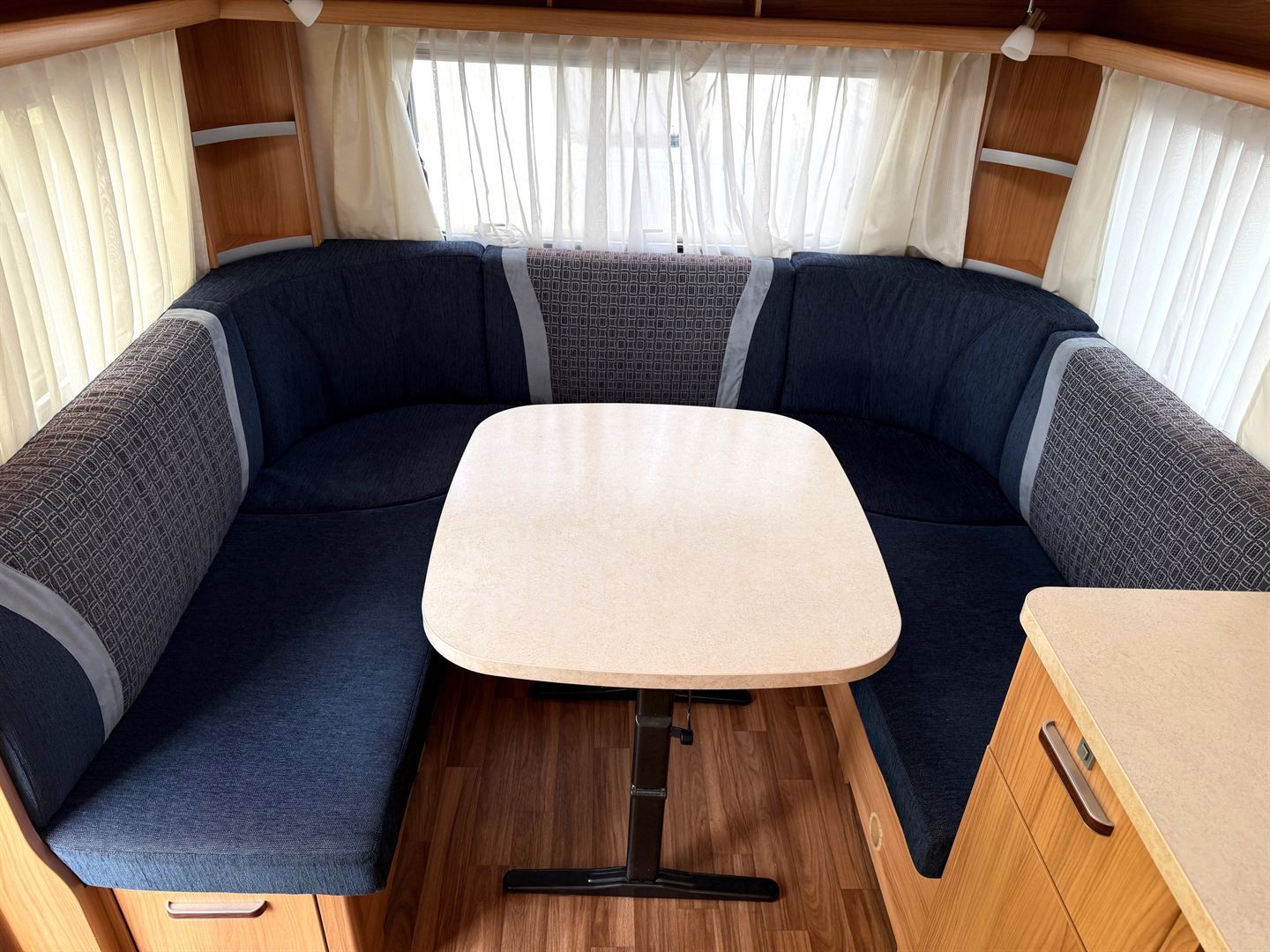 Velké rozkládací sezení do ,,U", francouzská postel, kuchyň, WC se sprchou a sprchovým závěsem , toaletní koutek